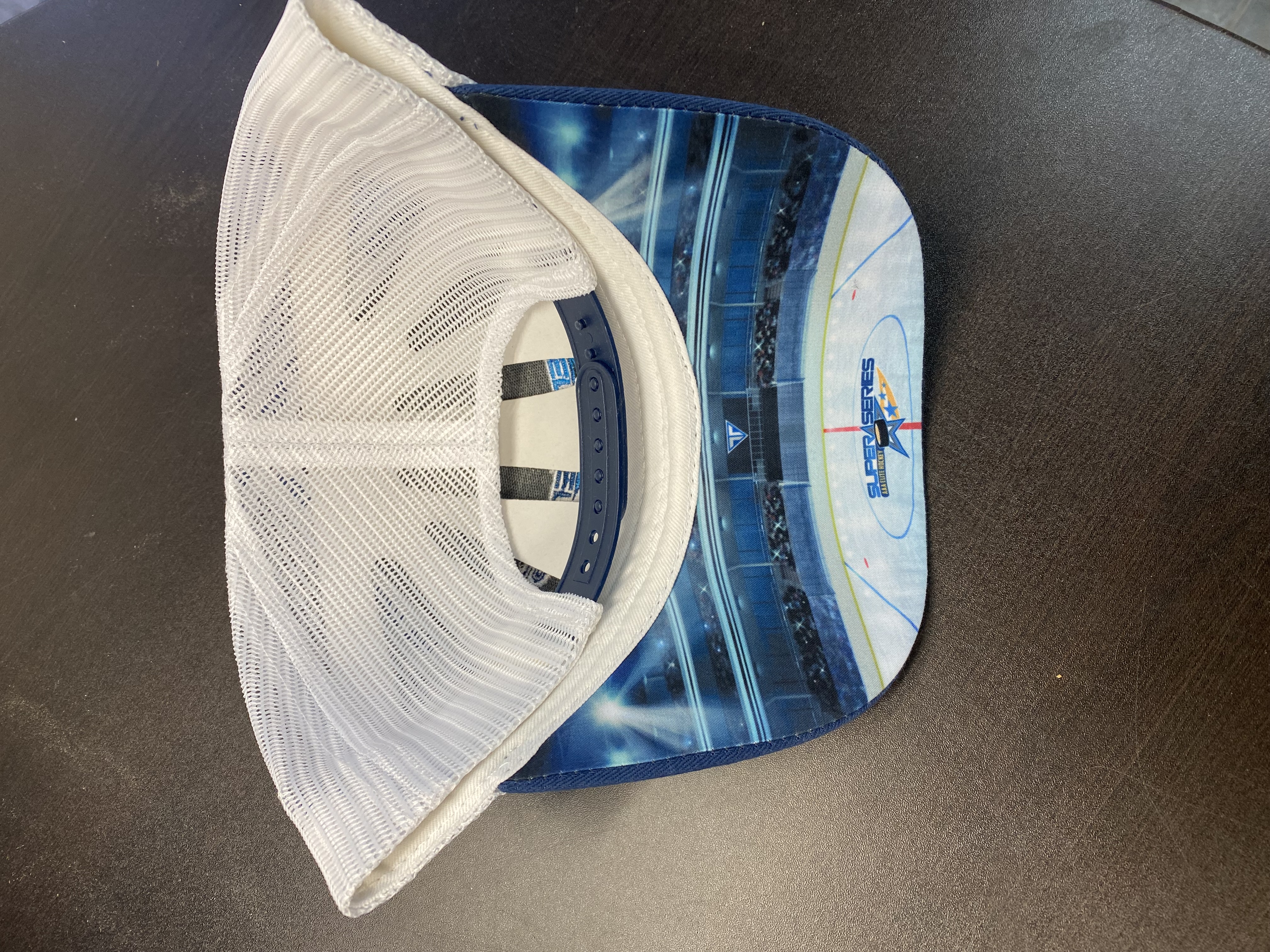 Adjustable snap back baseball hat with Super Series embroidered logo with sublimated bill. Option to add number
